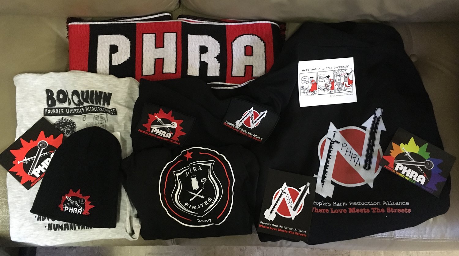 The PHRA Merchandise Grand package guarantees you all merchandise created by The People's Harm Reduction Alliance every year. This includes all of our one-of-a-kind special edition T-shirts, one hoodie, one Soccer scarf, PHRA beanie, along with patches, magnets, stickers, and buttons. Every single thing we produce in 2017 you will get including many one-of-a-kind items.